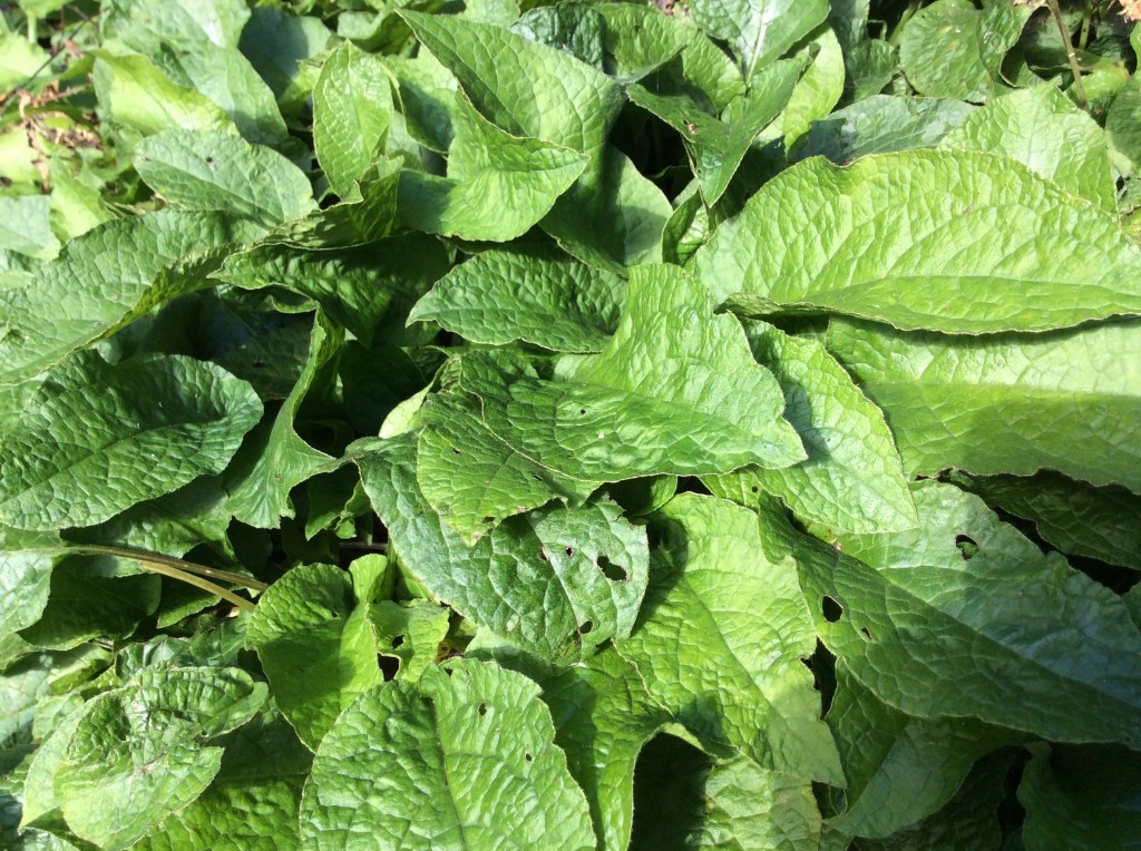 Comfrey is a real wonder herb – it is used in healing salves, to restore lustre and shine to hair. Our chickens loved pecking at the comfrey plants – it’s high in protein, so very good for them. And…our honeybees feed on the flowers in early spring.