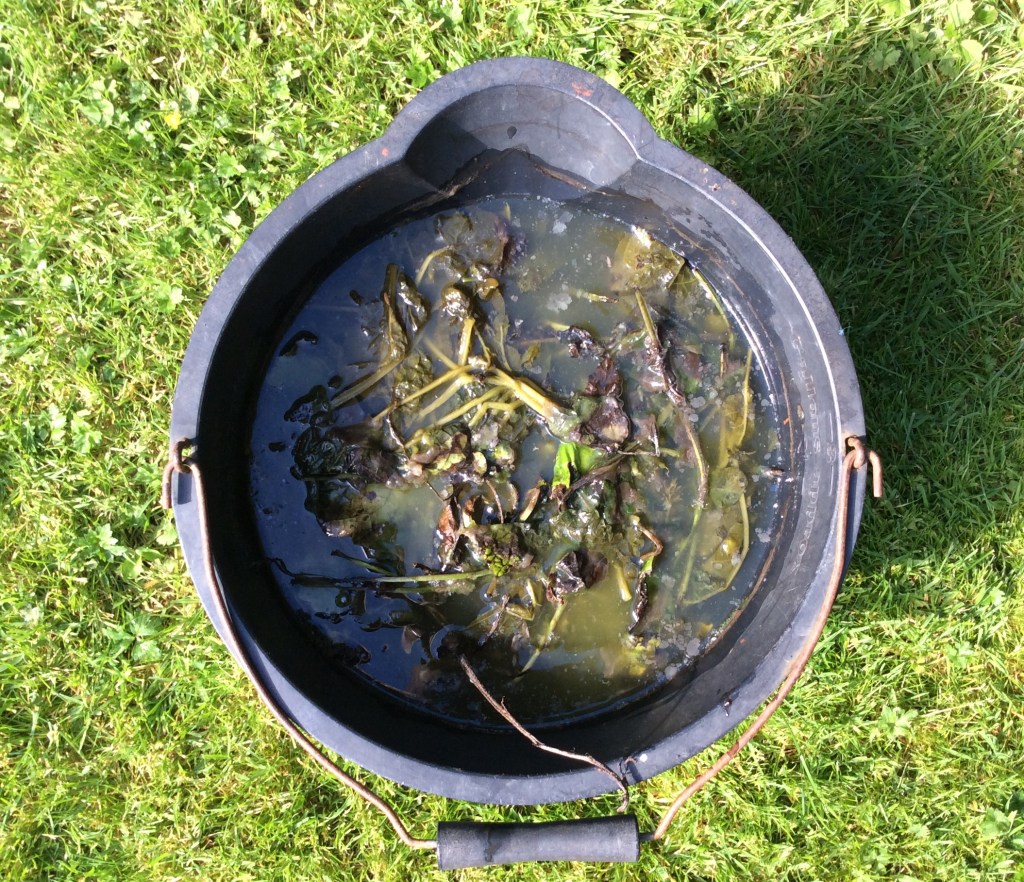 To make liquid comfrey feed, just pick the comfrey leaves from the base of the plant (you might want to use gloves as the hairy leaves can irritate). Chop them up and pack them into a bucket or better still, a tub with a lid (we used an old fat ball tub) – it does smell so the lid keeps the aroma contained and stops mosquitoes from laying eggs in the water. Cover the leaves with water – weigh them down with a large stone or old brick – and leave for a few weeks until you can see a brown smelly liquid.