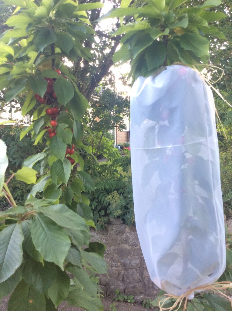 Last year, I was fed up with looking at empty cherry tree branches, so I made some ‘sleeves’ from some old netting to protect them from pesky predators. Hey presto – fabulous cherries for us, and I did leave a few for the birds too.